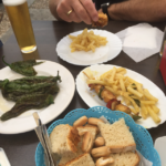 At the next town-which I only know as ‘babe, arce, nipple, oh yeah, sexy”, we park and have a great tapas meal in the town square. 6 tapas items-seafood croquettes, roasted chicken, meatballs, fried green peppers and venison. Along with cheeses and breads and six beers. All for 24 euro (about $35 CAD). It is soooooo good. And we are happy we stopped in this dirty dirty town.