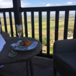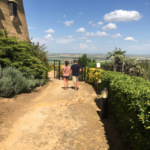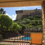 We make it to our next Parador and are given, once again, the best in the house room wise. Thank you again Nicole. We have the corner room with a wrap around deck and full view of the quilted valley below. We have been given Champagne chilled on ice in both of our rooms with fresh apricots. High on the valley wall, we can see for miles and miles. Its staggering how much agricultural farm land there is-and how many animals! Sheep and horses, chickens and birds. Its a show in itself and we watch them being herded-all the sheep moved to their night pens and the chickens let out for their supper. The birds are dipping into the pool for a drink one at a time in the most mesmerizing dance. So after sipping on our champagne, we decide that we should walk down to the pool and have a look around this majestic castle.