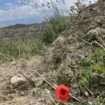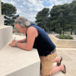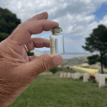 We eat lunch here at the memorial- sharing a bottle of wine. I take out something I brought just for this occasion. 4 jars with tiny scrolls rolled up inside… a scroll for each of us to write anything we want. We do, Gary and Nicole combining their scrolls in one bottle and burying them under Harry’s stone. Using the other bottle to gather some soil for home on the mantle. A reminder of the preciousness of life taken- a think you left.