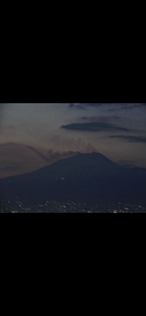Get home and make STEAK and baked potatoes. The thickest largest steak you’ve ever seen…on a brickette BBQ. And that’s when we notice some loud noises coming from Etna…and as we look in her direction, the sun going down…we see it. SHES ERUPTING!!! Full flame and lava spewing out her top every 15-20 seconds!!!!! I. am. Beyond. Excited.