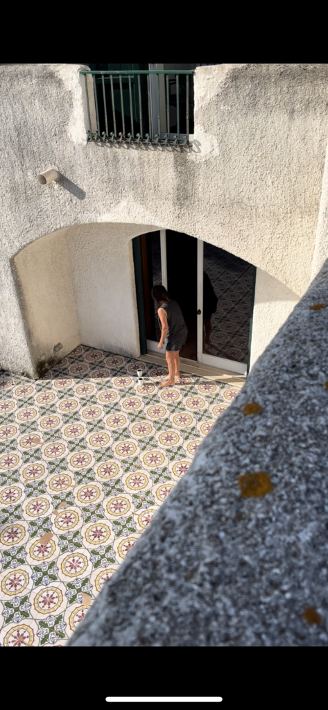 A large ornate steal gate opens to a stone paved driveway- and leads down to a white stucco house with green shutters. I hear the Godfather music in my head- probably because Nicole is humming it- and we hop out. Mr. Gianni is enthusiastic – he’s the manager of the property- and he and his wife have come to greet us and show us a few things around the property. He opens the doors to a large room filled with ceramics and couches, huge dining table and armoires. And he starts to show us the rooms. He has opened the two masters- one at either end of the upstairs level each with an ensuite bathroom- large and open- HUGE glass doors in each that open out on to separate decks. Mine and Chris’s its own walled terrace- 30×20 at least. Nicole and Gary’s the same size with a lovely stone staircase that leads down to the pool and courtyard. We start to count bedrooms. 1,2, 3, 5, 7, NINE. We knew it slept 17- but we assumed that was an Italy 17- where everyone is piled ontop of everyone and they put 3 in a bed- if you pull in your side mirrors – 4. He shows us the 10 bathrooms. TEN BATHROOMS. 6 with bath and shower. 2 with just showers and 2 with just toilets. Each is decorated with the same ornately cut tile – each a different color. We MAY have overestimated our needs…..a little…..