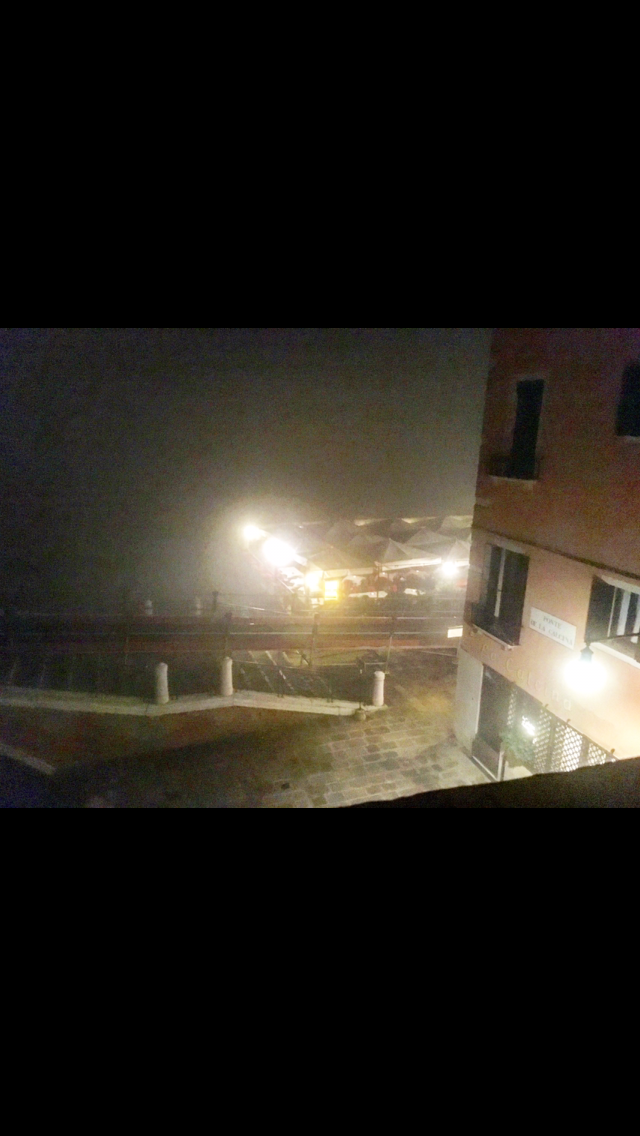 Back to our rooms for bed time for Gonzo and Camilla. Mom’s pedometer says that we walked almost 13, 000 steps (almost 7 Km) today. Good thing we were keeping it light for them….although they seem FINE. I’m about ready to die and I’d pay good money for someone to roofie me and put me to bed right now, but yeah. The 70 year olds seem to be doin great. In any case, we put them down for the night, and we set up the rum and cokes. We decide this is more of a Muppet Speak Easy, since we smuggled the rum here from San G without mom and dad knowing. Its not that we don’t want to share it, its just that we don’t want to share it. So, we enjoy the speak easy for a few hours and are off to bed with all our windows and doors opened-listening to the buzz of Venice. . Well, some of us are. Welling up while I tell you this. I sneak out after I get ready for bed and to check on the candles i have set up on the railing- at about 1am…and see tiny little Judy sitting on her deck having wine in the dark. Head bobbing around watching all the boats in the fog-with the biggest grin on her face. There is no greater joy then feeling like you’ve made your mom happy is there? I back away and out of her sight before she notices me. Good job Nicole and Karen. She won’t forget this-her Venice dream coming to life.