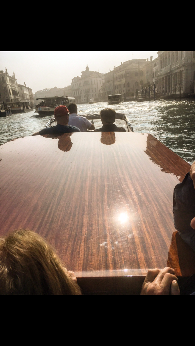 We make our way to the water taxis (no water bus for us. They are too crowded and stop too many times) and see the delighted look on the taxi drivers face when he realizes that we have all those bags and all those people. They generally charge based on both. We dicker a price (90euro) and off we go. Nothing makes you feel more like a rock star then standing up in the back of a Varporetto (water taxi) with the roof open, while you speed past all the gondolas and people, to your water front Venice hotel. Mom’s eyes are wide with fascination and dad just keeps saying “oh my, oh my”-until we remind him that loose lips sink perfectly good dentures. Mouth shut Gonzo.