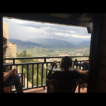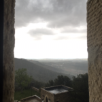 We are given our room assignments, and as usual, Nicole has made sure we have the nicest rooms offered in the entire castle. Huge and with a view of the valley like nothing I’ve ever seen. Four poster bed, peaked windows, stone and dark wood. A FREAKIN’ CASTLE. We settle in a little and meet in Nicole and Gary’s room for the wine and snacks we bought earlier and the storm finally catches up with us. In the distance, while we sit cozy on our deck, we see lightening, hear thunder and watch the sheet of rain and HAIL descend on the valley. Everyone is happy for me. I got my show. You may think its weird, but on every vacation, I pray for a storm. I don’t want rain every day-or rain while we drive or sight see. But to see a place in the rain? I think it feels so- intimate? Is that the right word? I love seeing a landscape in all its forms, and the romantic nature of a good rain storm makes me feel more cozy, and more like i really know what a place is all about. Thunder and lightening? Well that’s just a crazy stoke of good fortune. And I’m in my glory. We sit and drink great wine and talk about the adventure getting here and we are finally on vacation. I can see Keddy’s shoulders going down, work washing away, and my husband is mine again. I can see Nicole, all the stress of “will this work? Will the hotel be nice??” fade, smiling and content and comfy with those slightly red cheeks from wine. Gary is smiling too-contented and finally here.
